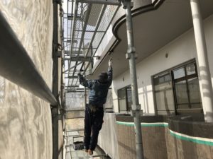 外壁の色替え部分、中塗り+上塗り作業です。